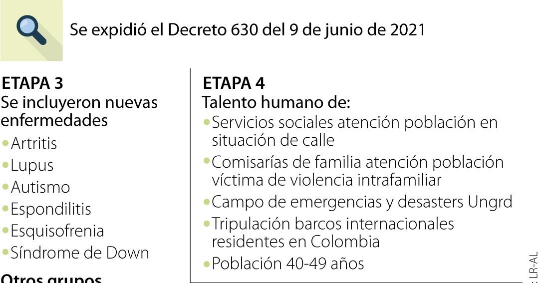 Colombia MinSalud confirma el inicio de la Etapa 4 de vacunación contra el covid-19 desde este martes Con esta decisión se ven beneficiados inicialmente los colombianos que tengan entre 45. La población privada de la libertad que esté cumpliendo su condena o medida de aseguramiento en la modalidad intramural. Estas son las etapas de la vacunación reveladas por el Gobierno Nacional.